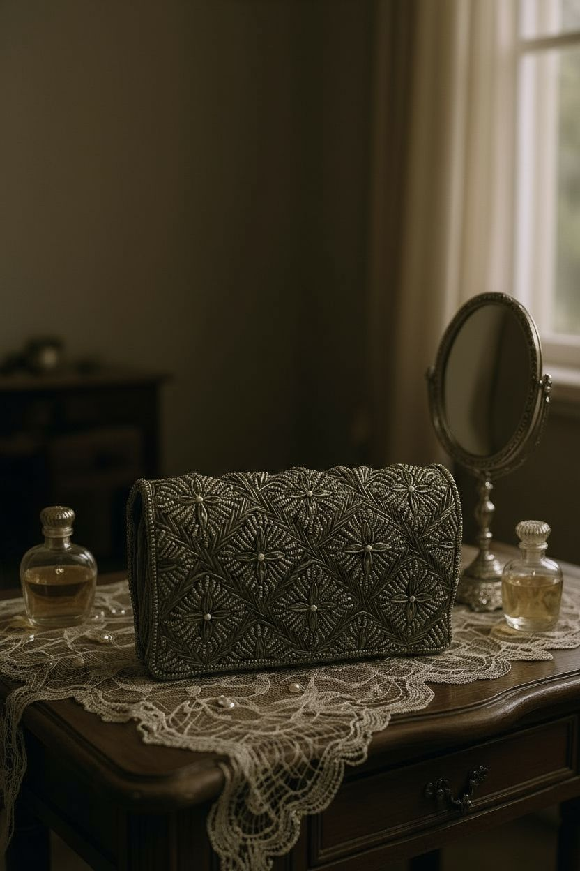 This beautiful upcycled evening bag is a handheld bag with a rectangular shape and a fold-over flap that resembles an envelope with a gold chain strap. It's designed for formal occasions like weddings, galas, and cocktail parties. Adorned with gold beads and abstract designs makes this quite a beauty.