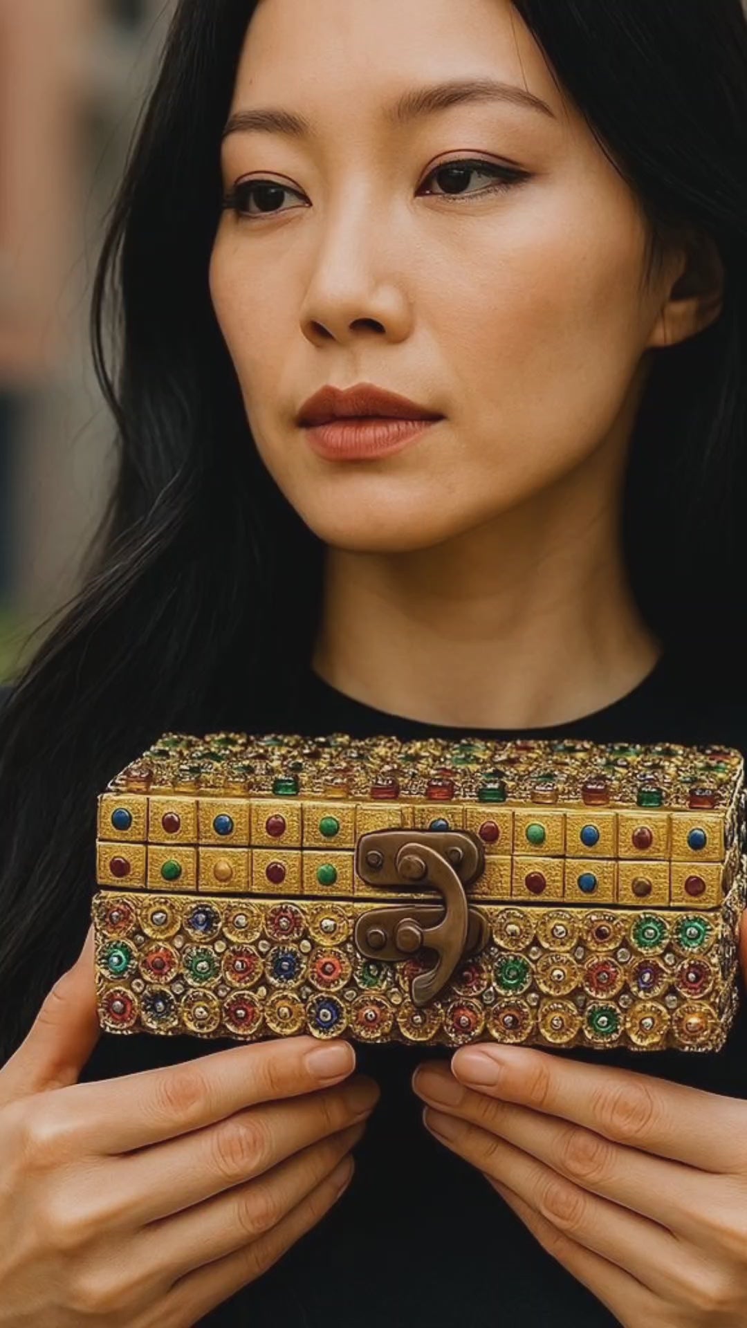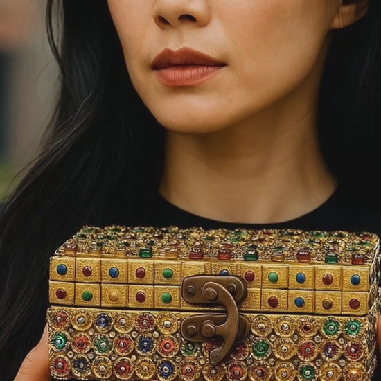 This gorgeous one of a kind Gold beaded memory box is great for keeping your precious keepsakes and everydy lifes trinkets. This viabrant box is decorated with gold enhanced beads with hues of red, blue, green designs throughout and a multi-colored heel adorned on top. The inside is decorated with all gold trimmings. Great conversation piece for your home or office desk.