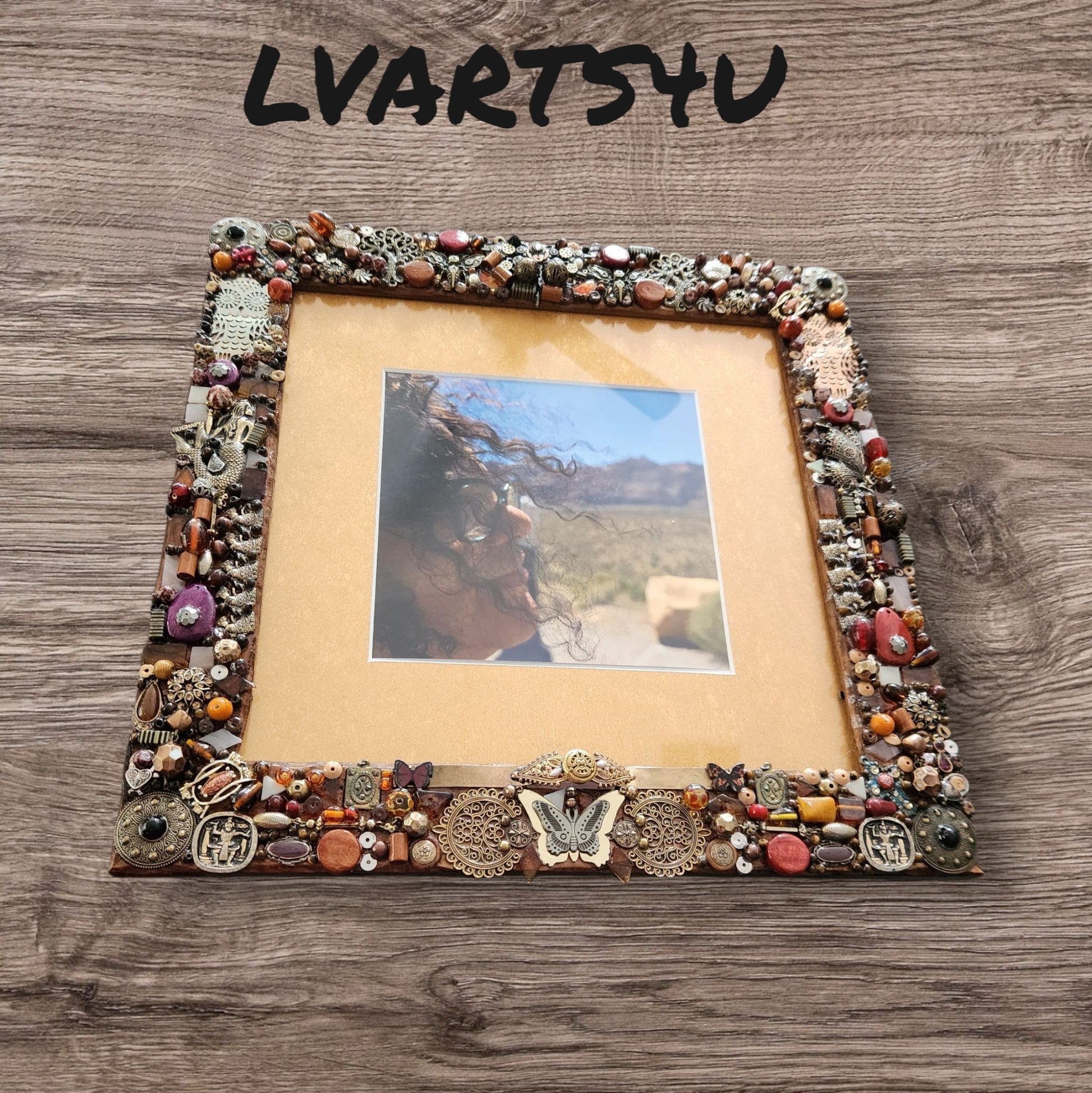 This beautiful handcrafted embellished large photo frame is created with a mix of upcycled beads and vintage jewelry that is set and embellished around the 11x14" inch wooden frame.