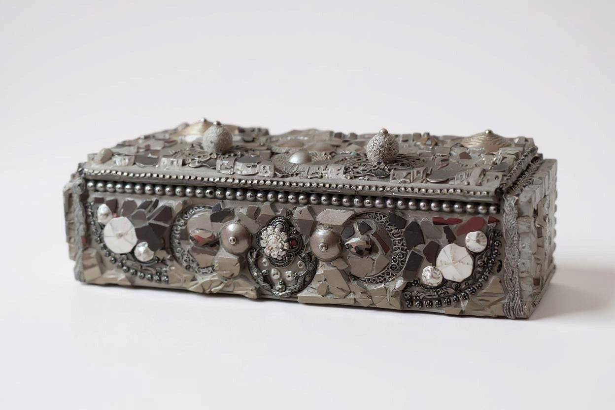 This gorgeous one of a kind Memory Box is great for keepsakes, glasses, keys and everyday life's trinkets and accessories. These vibrant boxes are custom decorated on all sides (including the inside panel walls). The insides can be decorated with mosaic glass. Hand painted and hand beaded so the colors will vary throughout the design. Great conversation piece for the home or office. (Pictured box design are customers personal ideas and colors). The price varies depends on the size box. This box dimensions are 9.25x4.25