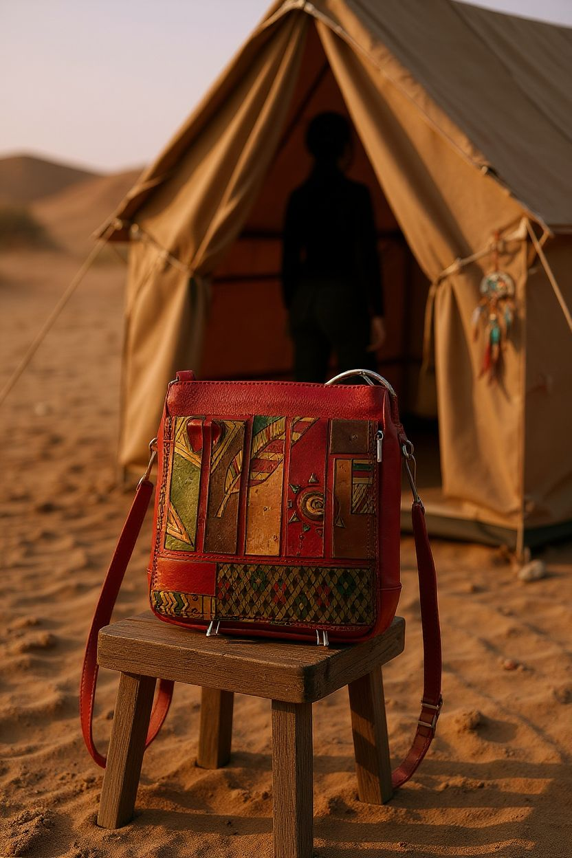 The example of what I can create on your own bag or you can feel free to purchase this beautiful bag. This 9x9.5' Red leather bag has 6 storage pouches, and lots of zippers for securing your personal items. Because its handpainted and not massed produced there may be slight color variations.