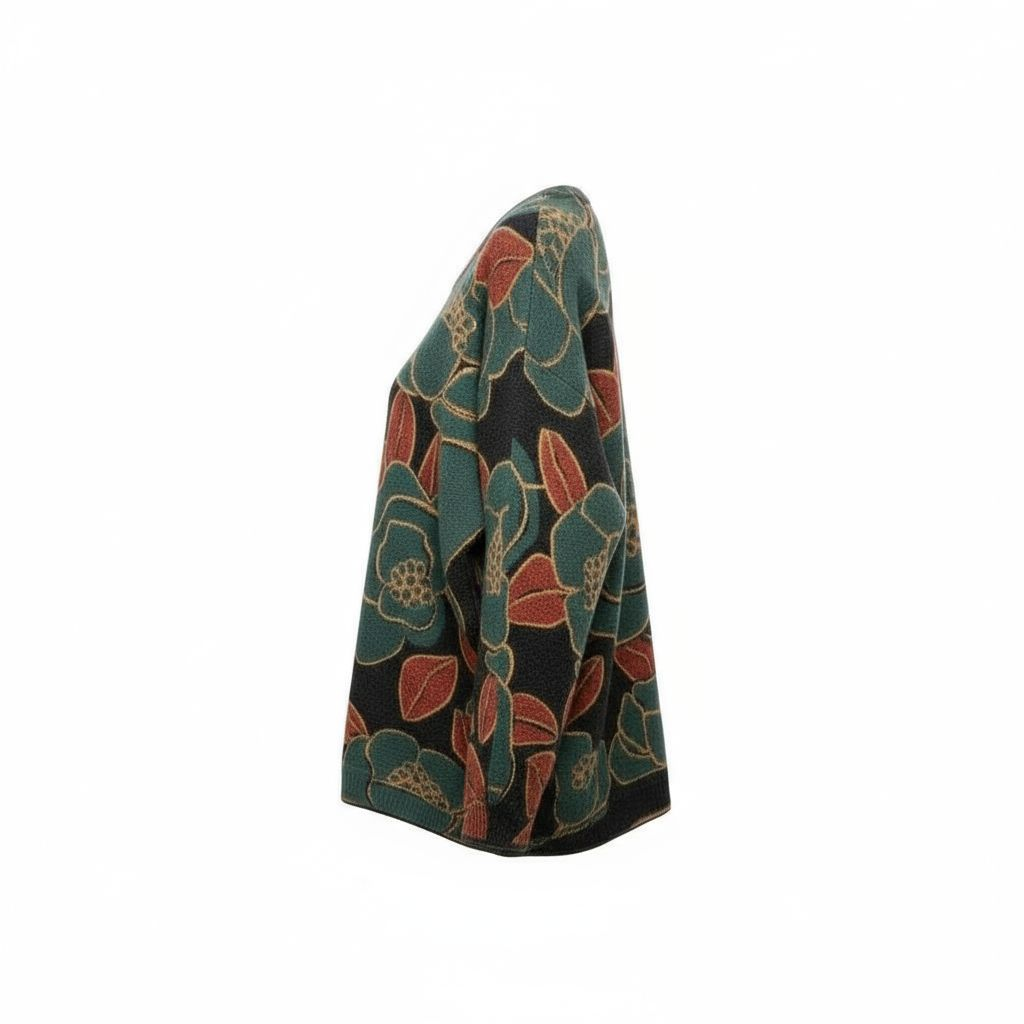 This beautiful upcycled pullover knit printed sweater features beautifully placed green flowers with red leaves on a black background. The flowers and leaves are outlined in gold making this sweater stand out to take notice. Great for weekend outings, school looks, brunch, holiday seasons and movie nights.